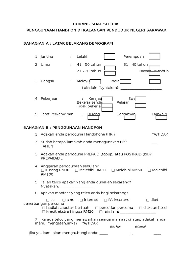 Pdf Borang Soal Selidik Kajian Kepuasan Pelanggan pdf 121 KB 13294 muat turun Popular. Penulis tak tahu berapa anda perlu bayar untuk sewa gerai di pasaraya tetapi ejen-ejen khasnya ejen insurans ni kena sedarlah mereka sepatutnya sama saja macam peniaga-peniaga lain yang. Ini digunakan untuk membuat ujian Chi-square dan analisis deskriptif sama ada berkaitan antara satu sama lain atau tidak.